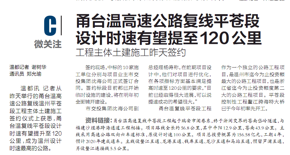 甬台温高速公路复线平苍段设计时速有望提至120公里