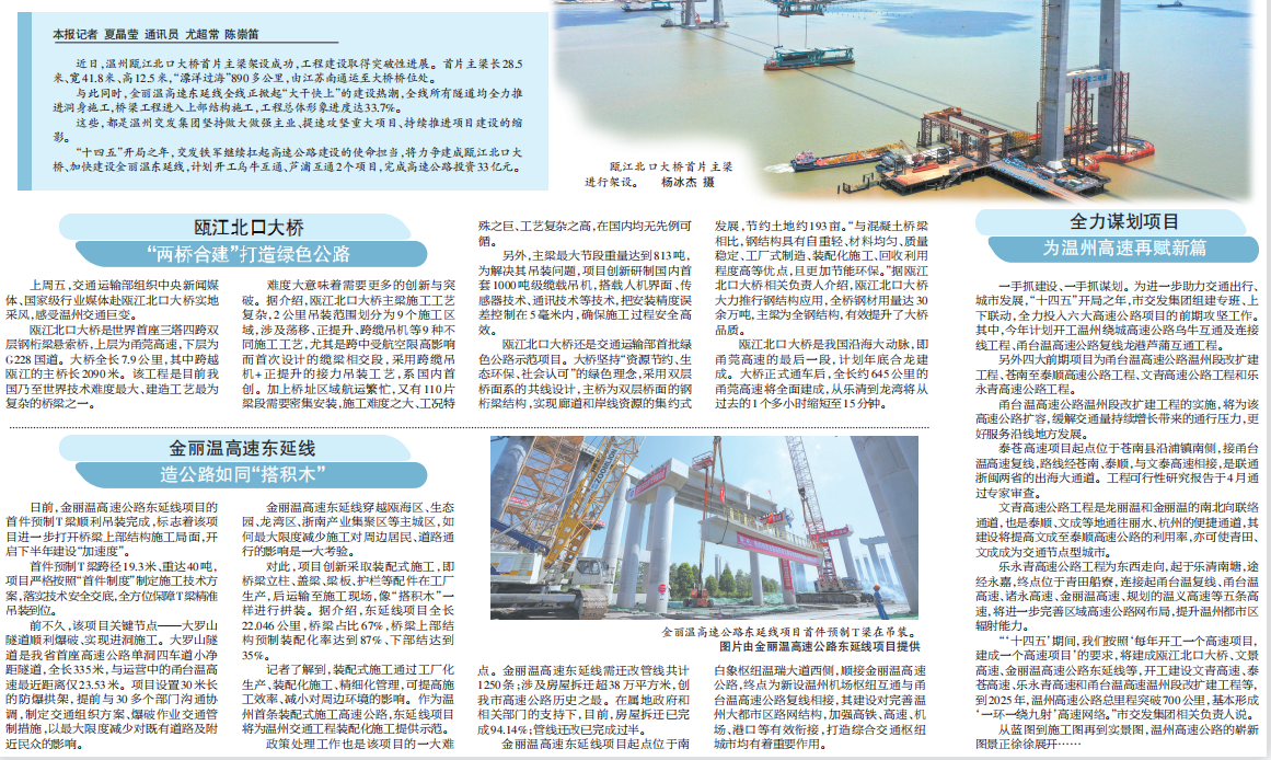 瓯江北口大桥“两桥合建”打造绿色公路、金丽温高速公路造公路如同“搭积木”