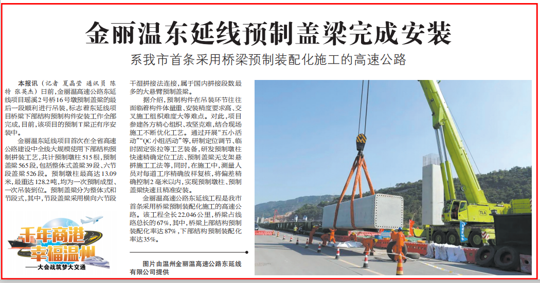 金丽温东延线预制盖梁完成安装