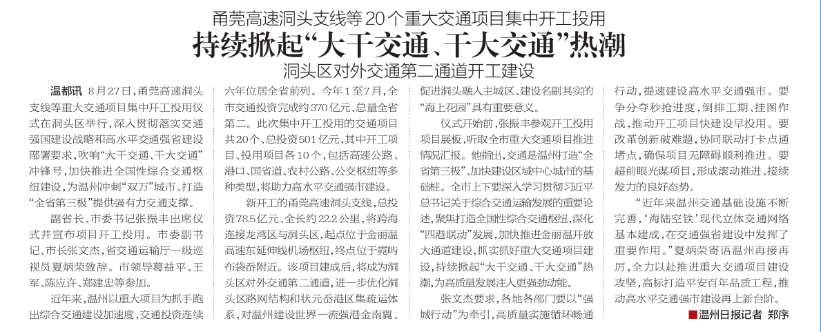 甬莞高速洞头支线等20个重大交通项目集中开工投用