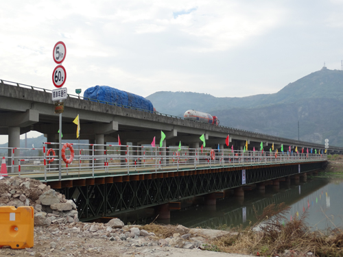 银溪河便桥长108米,宽6米,主体承重采用三组双拼六榀贝雷梁,全桥用钢量达330吨。该桥按60吨荷载设计,最大载重量可达90吨,满足施工期间所有载重车辆、机械的通行要求。