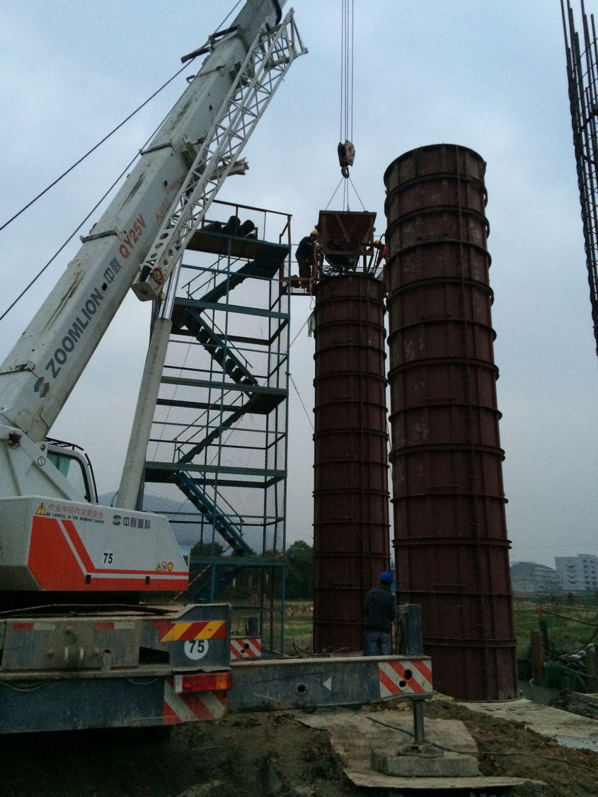 左幅6-0#立柱设计直径1.8m,高26.5m。首节浇筑8.1m,采用爬梯支架法施工。为确保首件立柱的顺利浇筑,第5标段施工前开展墩柱模型试验,检验模板、脱模剂、混凝土及振捣工艺等是否满足要求,为正式的施工提供可靠数据。施工过程中,按施工工艺要求,严格控制各道工序,从钢筋笼制作安装、立模、混凝土拌和、浇筑等环节进行详细的检查,采用串桶入模的方式,防止混凝土出现离析现象,振捣过程控制好振捣棒插入、拔出速度、插入点间距以及插入深度,严防过振与漏振现象,最大程度保证首件立柱的施工质量。接下来将召开立柱首件工程总结会,查漏补缺,为日后大量立柱的生产打下坚实的基础。