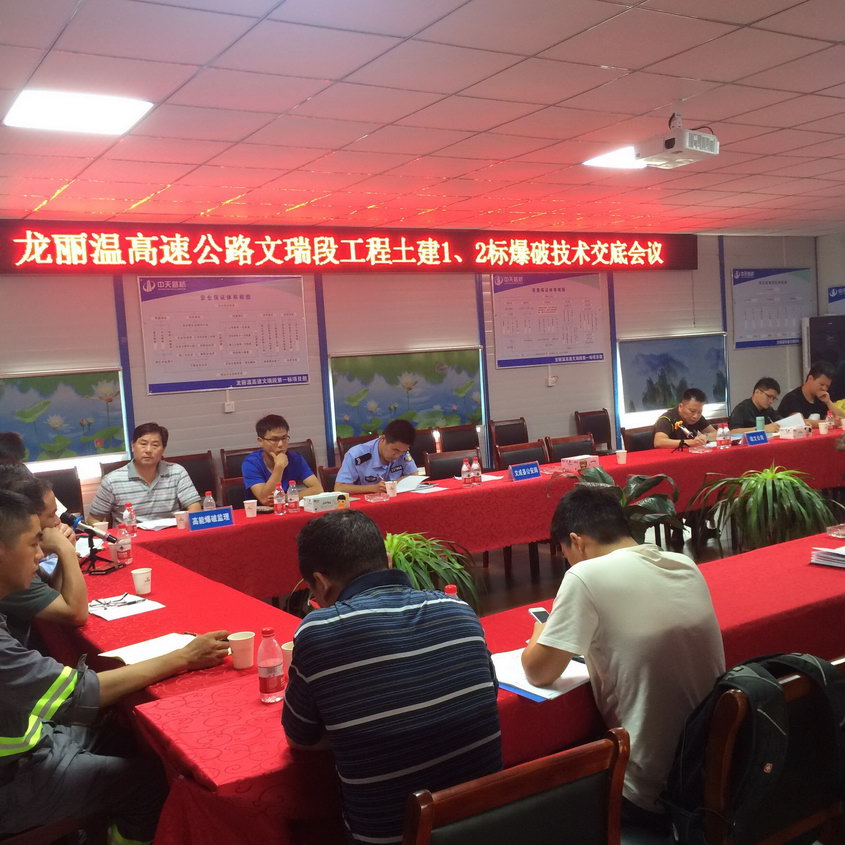 为顺利实施龙丽温高速公路首次爆破工作,2016年8月3日上午,瑞文公司召集工程土建施工第1、2标段、第1 监理办、浙江省高能爆破工程有限公司、浙江环境监测工程有限公司及浙江宏大工程爆破有限公司有关人员在第1标段项目部召开了爆破技术交底会议,龙丽温高速公路文成段工程建设指挥部、大峃镇派出所受邀参加了会议。