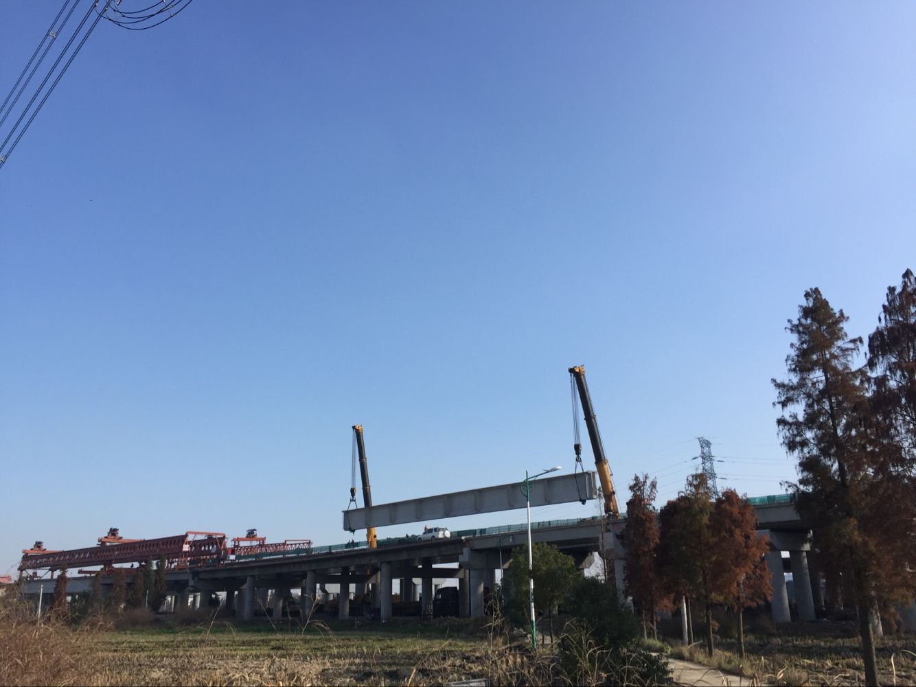 万全枢纽C匝道50米T梁位于第4孔,共5片。50米T梁作为绕西南工程最长T梁,是10标当前最重要的节点目标。由于C匝道桥不能作为50m梁的运输通道,10标项目部以超常规思维规划运梁路线,在过程中严格遵循“一点都不能差,差一点都不行”的严谨态度,采用主线运梁、隔空吊梁的方式采用两台350吨汽车吊将重达220吨的T梁进行空中调转,从邻近的主线吊转到C匝道上,从而实现安全运架梁。50米T梁的顺利架设,标志着10标离年底目标更近了一步。