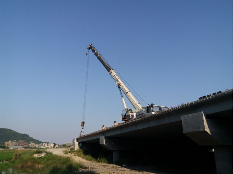 16米空心板重达23吨,为保证吊装工作的顺利进行,经项目部研究决定左幅采取2台25T吊机,以“双机抬吊”方法实行安装;而在右幅没有便道的情况下,利用简支梁桥的受力特点,梁车及吊车直接在新架设的桥板上作业,80T吊车在桥面上支腿,采取“单机旋转吊装法”逐跨吊装。