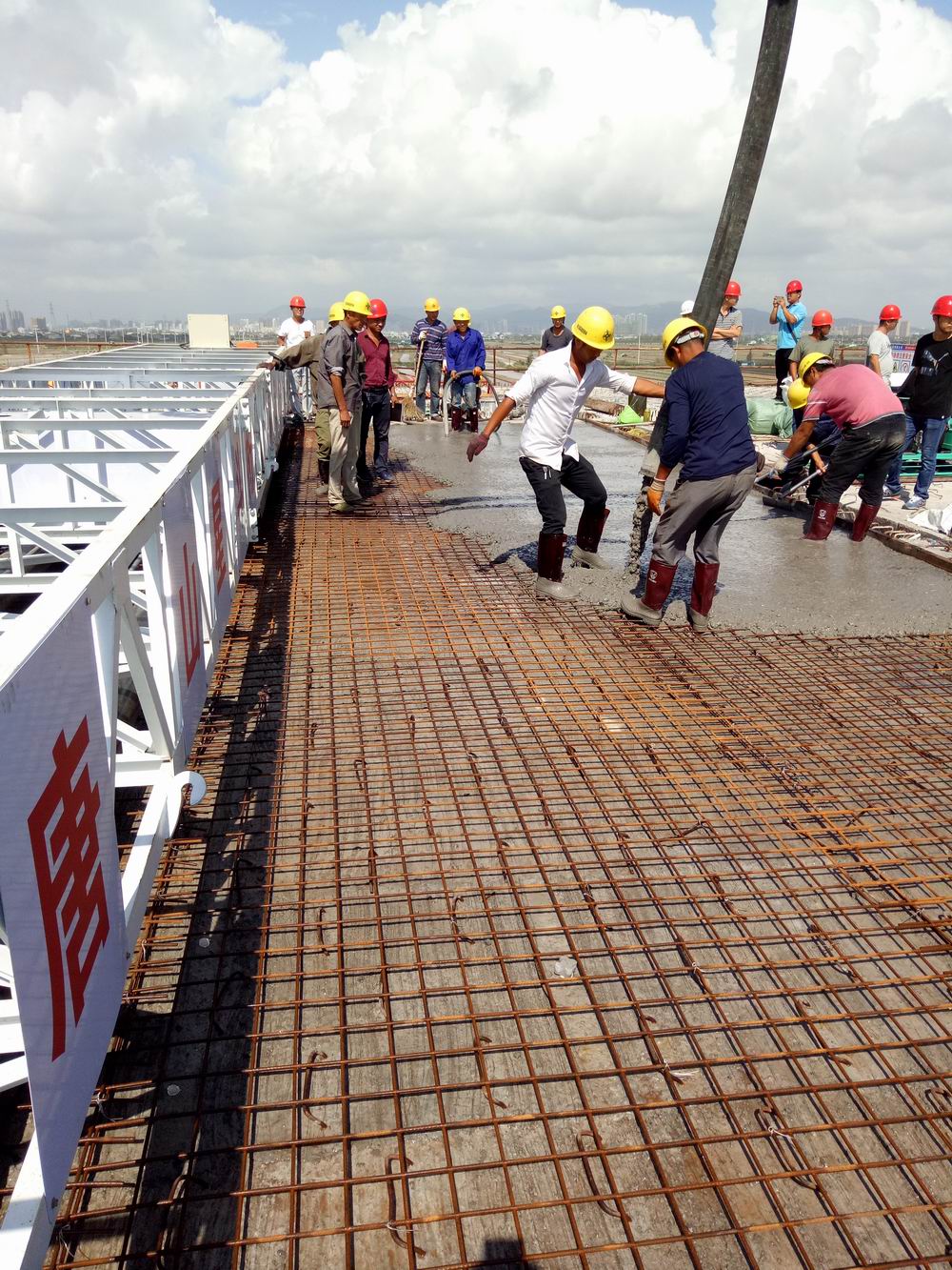 8标路线全线长3.83公里,全部为桥梁结构,桥面铺装面积总计109495平方米。本次桥面铺装位于左幅第14联61-64#墩,共计浇筑1220平方米。桥面铺装层混凝土浇筑采用罐车运输,泵车浇筑,人工配合混凝土摊铺机整平摊铺,后续辅以人工进行收面、压光和拉毛。在整体施工过程中,沈海公司要求项目部责任分工明确,施工规范到位,现场把关严格,切实保障桥面现浇混凝土的质量。