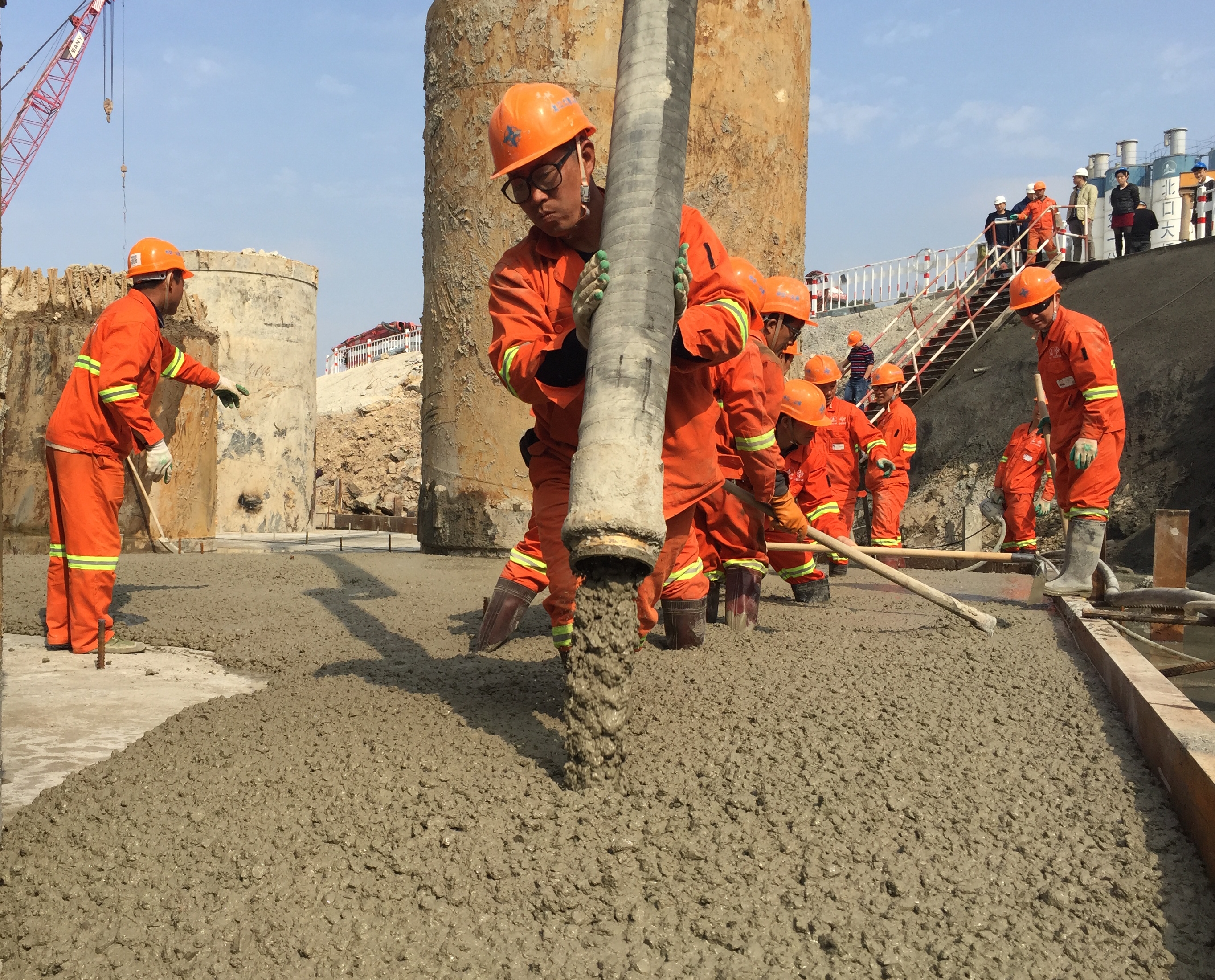 瓯江北口大桥北塔为H型索塔,塔高137米,桩基部分由30根长约60米、直径3米的超大桩基组成。其基础为哑铃型承台,总体平面尺寸82*26.2米,两半承台之间采用系梁联成整体,承台与系梁等厚,均为8米,封底砼厚1.5米。北塔承台施工的顺利进行为该项目完成年底的施工进度计划奠定了坚实基础。