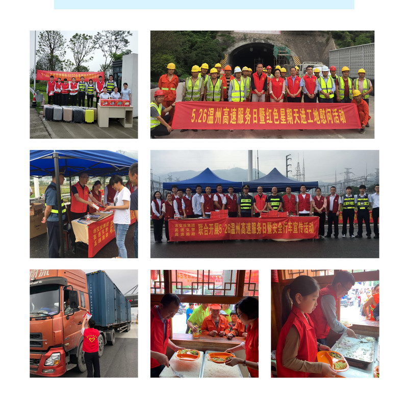 运营公司联合高速交警、高速路政等部门在温州东、潘桥、七里港等收费站现场设置了便民服务点,免费向过往司乘提供便民检修工具箱、医药应急药品箱等,并向他们免费发放了《浙江省高速公路地图》《货车“8.5折优惠政策”解析及节假日高速免费指南》等宣传资料;联合邮储银行在永嘉南、瓯北、仰义、荆谷收费站广场上设置了ETC业务办理点,为过往司乘免费办理ETC业务;联合温州市药师志愿者协会、谢金林银发工作室在状元亭为社区困难户、孤寡老人、环卫工人等提供免费午餐、义诊、义务理发等服务;在温州大桥南接线大修工程施工现场,向奋战在大修一线的施工人员送去了夏日慰问品。