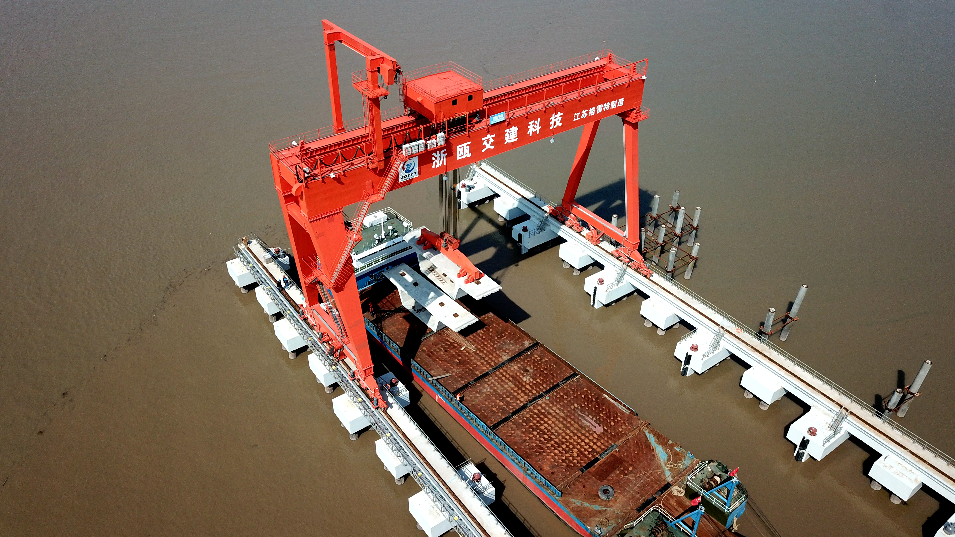 3月15日上午,温州交通城建工业化生产基地项目营盘基厂区一片忙碌,随着280吨龙门吊将一榀榀节段梁从堆存区缓缓吊装至厂区码头装船完毕,项目首批节段梁顺利出运,正式供应国家重点工程--瓯江北口大桥项目建设。