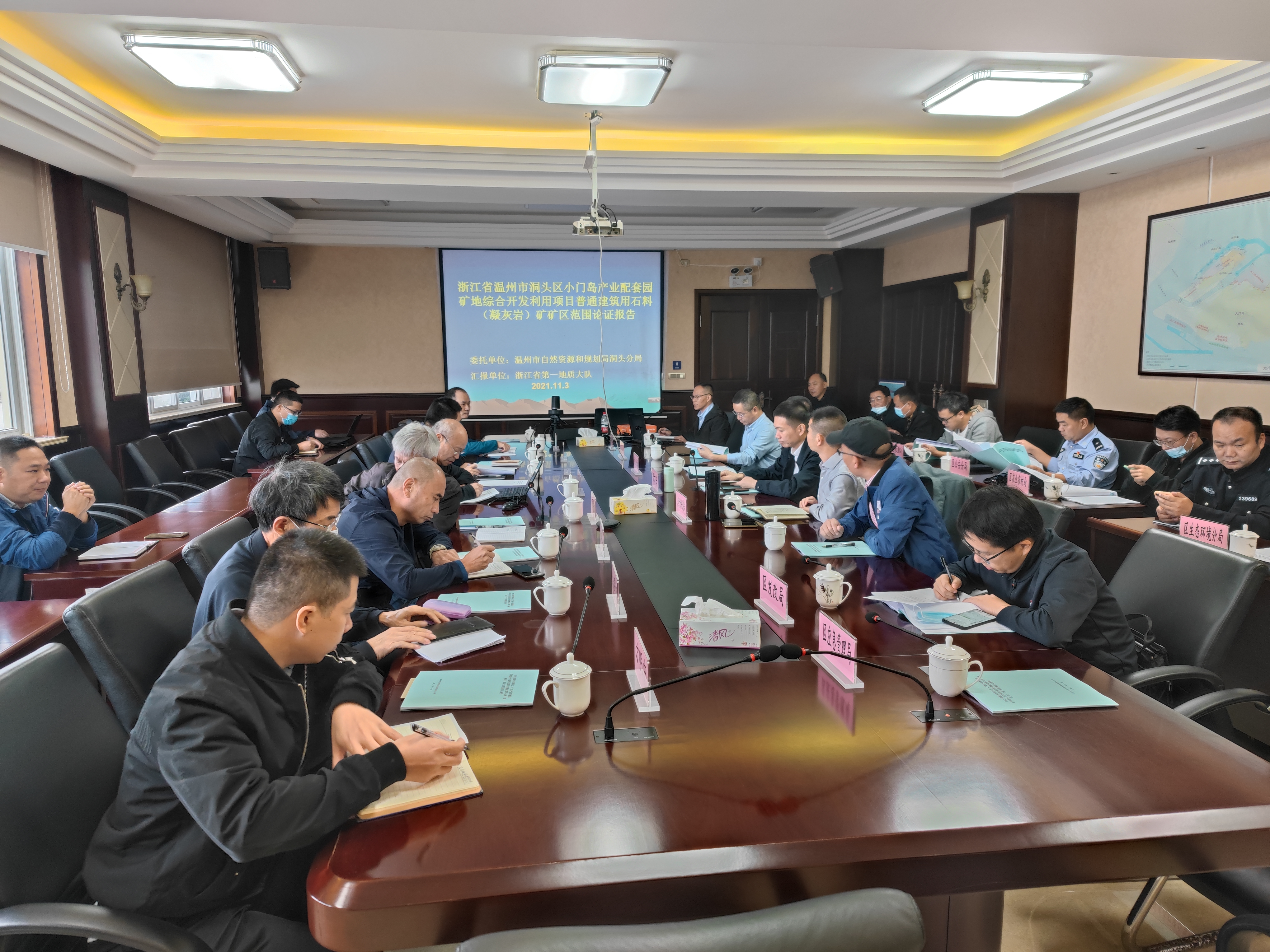 2021年11月3日,温州市洞头区人民政府张方任副区长在温州大小门岛投资开发有限公司主持召开《浙江省温州市洞头区小门岛产业配套园矿地综合开发利用项目普通建筑石料(凝灰岩)矿矿区范围》专家评审会,参加会议的有浙江省自然资源厅、温州市自然资源和规划局、温州市自然资源和规划局洞头分局、温州市生态环境局洞头分局、温州市公安局洞头区分局、区发改局、区农业农村局、区应急管理局、区文广旅体局、区交通运输局、大门镇人民政府、温州大小门岛投资开发有限公司以及文本编制单位浙江省第一地质大队。