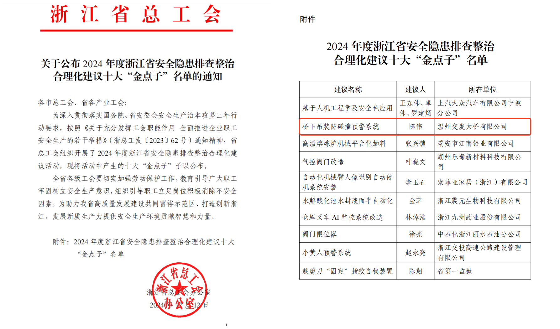 近日,浙江省总工会公布了2024年度浙江省安全隐患排查整治合理化建议十大“金点子”榜单,其中,由交发大桥公司提出的《桥下吊装防碰撞预警系统》光荣上榜,荣获浙江省安全隐患排查整治合理化建议十大“金点子”。