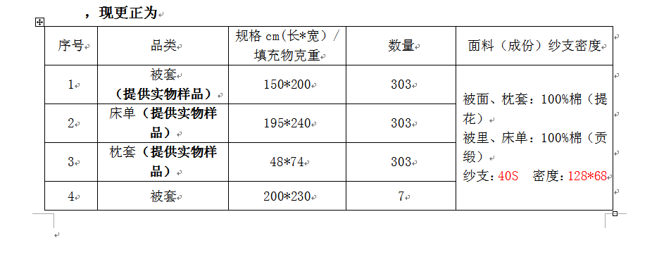 二、项目名称:职工床上用品