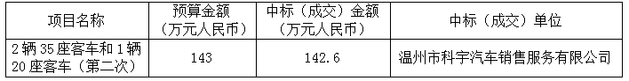浙江华诚建设工程招标代理有限公司受温州绕城高速公路西南线有限公司的委托,就2辆35座客车和1辆20座客车(第二次)项目(招标编号:Q-HCZBWZ18006)以公开招标方式进行采购,本项目于2018年1月24日发布招标公告,2018年2月28日在温州市公共资源交易与行政审批服务中心5号评标室进行评审,最后经评标委员会综合评定,确定本次中标(成交)人为: