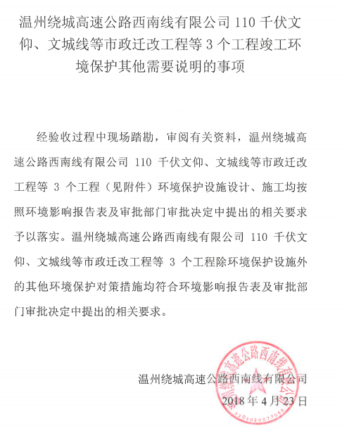 温州绕城高速公路西南线有限公司110千伏文仰、文城线等市政迁改工程等3个工程竣工环境保护其他需要说明的事项