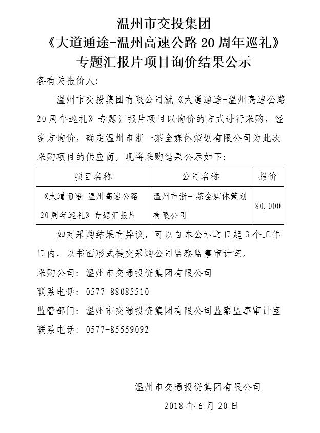 《大道通途——温州高速公路20周年巡礼》专题汇报片项目询价结果公示