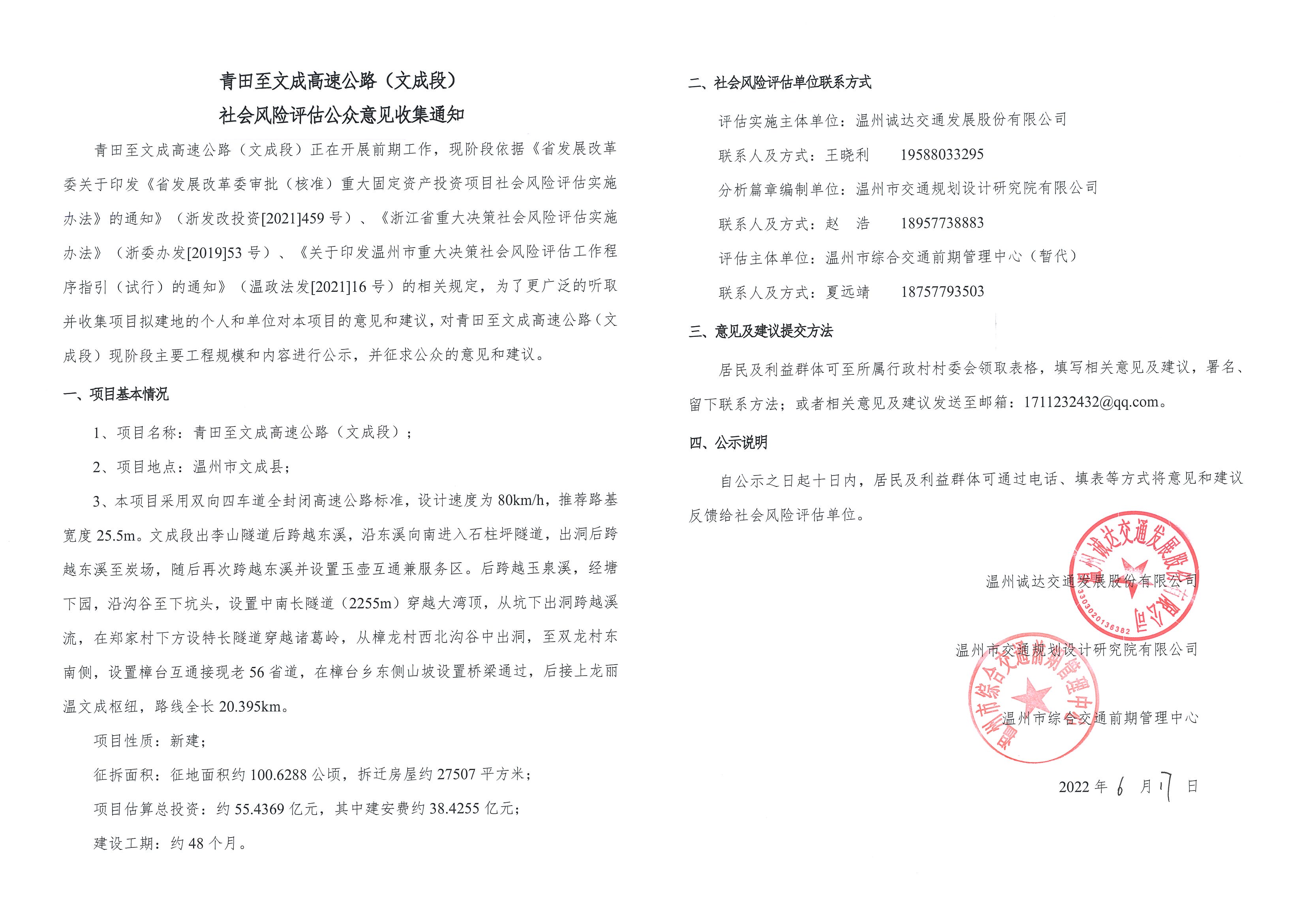 青田至文成高速公路(文成段)社会风险评估公众意见收集通知