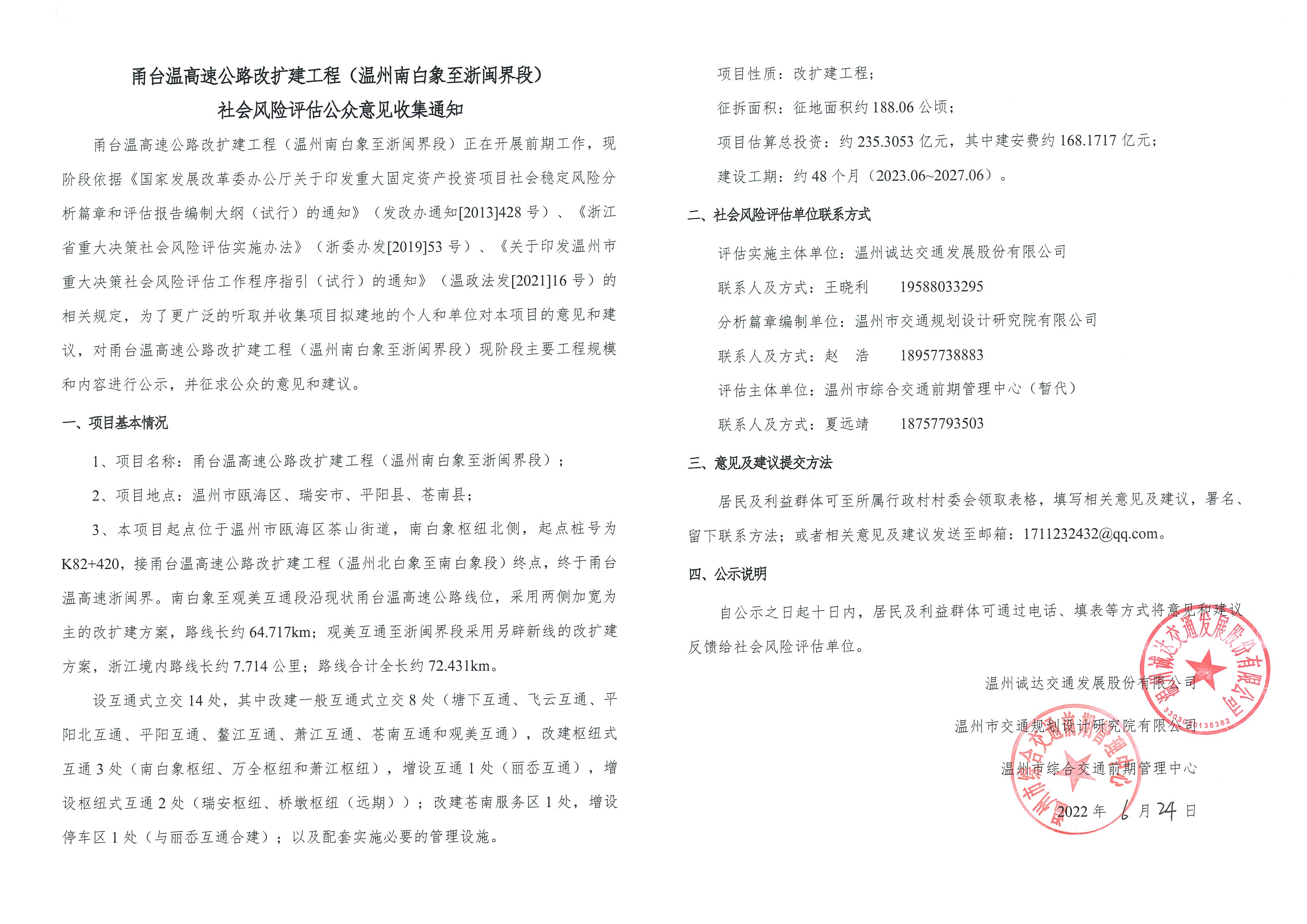 甬台温高速公路改建工程(温州南白象至浙闽界段)社会风险评估公众意见收集通知