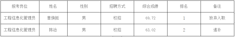 因报考必赢242net官网工程信息化管理员岗位总成绩排名第1名的考生自愿放弃入职资格,根据《必赢242net官网2023届高校毕业生校园招聘公告》,该岗位按总成绩从高分到低分进行递补,现由排名第2名的考生按规定递补参加体检考察,调整后名单如下: