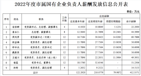 2022年度市属国有企业负责人薪酬发放信息公开表