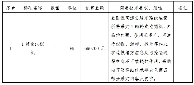 温州市远景交通工程管理有限公司受温州金丽温高速公路东延线有限公司的委托,就1辆轮式挖机以公开招标方式进行采购。现将本项目采购文件公布如下(详见附件),并公开征求投标供应商及专家意见。