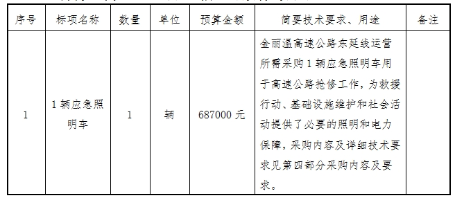 根据《温州市市属国有企业采购管理办法》《必赢242net官网国有企业采购管理办法》等有关规定,温州市远景交通工程管理有限公司受温州金丽温高速公路东延线有限公司委托,就所需1辆应急照明车以公开招标的方式进行采购,欢迎国内合格的投标供应商前来投标。