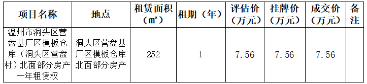市交发集团瓯越交建公司温州市洞头区营盘基厂区模板仓库(洞头区营盘村)北面部分房产一年租赁权资产出租结果公示