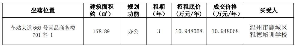 市交发集团温州房地产公司关于温州市鹿城区车站大道669号尚品商务楼701室-1办公用房三年租赁权竞价结果公示
