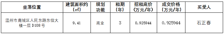 市交发集团温州房地产公司关于温州市鹿城区人民东路东信大楼一层D108号商业用房三年租赁权竞价结果公示