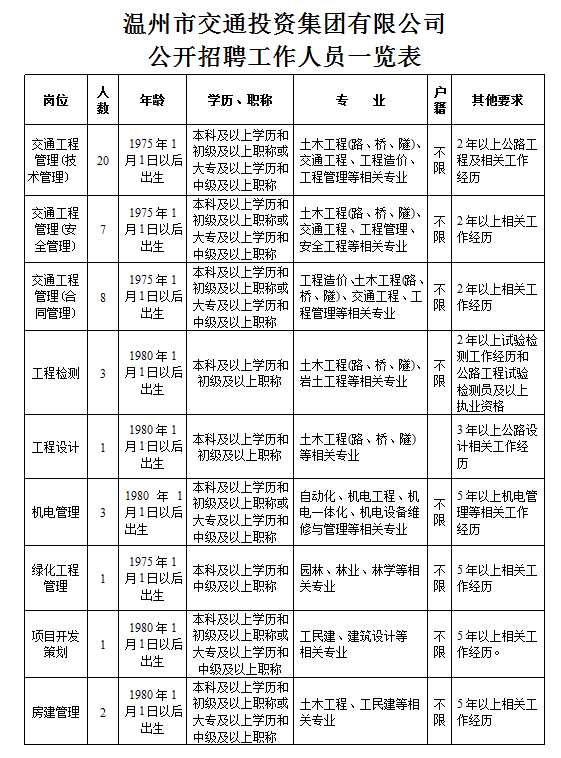 招聘岗位具体要求见《温州市交通投资集团有限公司公开招聘工作人员一览表》。