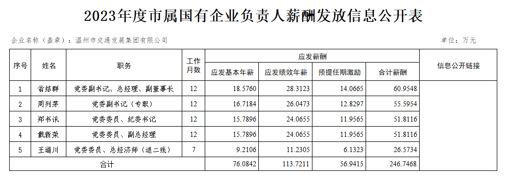 2023年度市属国有企业负责人薪酬发放信息公开表