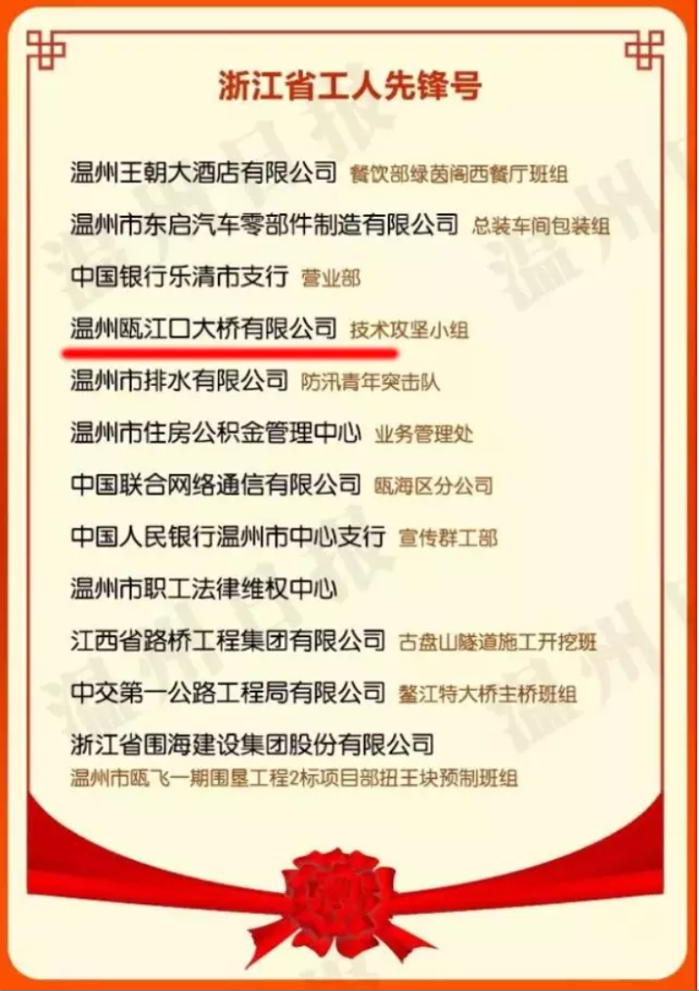 温州瓯江口大桥有限公司获省工人先锋号称号