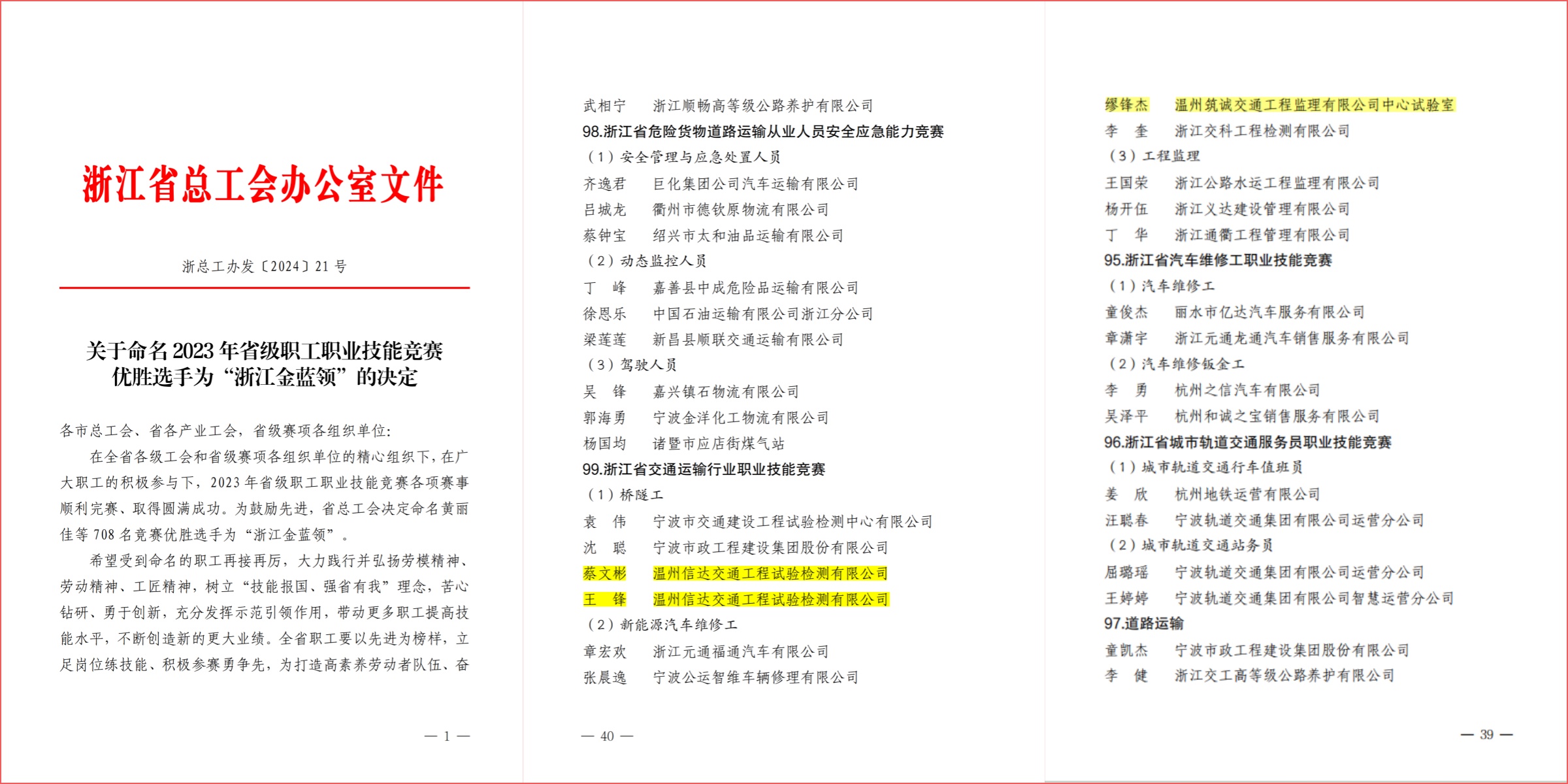 近日,浙江省总工会印发了《关于命名2023年省级职工职业技能竞赛优胜选手为“浙江金蓝领”的决定》,公布了2023年“浙江金蓝领”名单,集团下属单位信达检测公司蔡文彬、王锋,筑诚监理公司缪锋杰榜上有名!