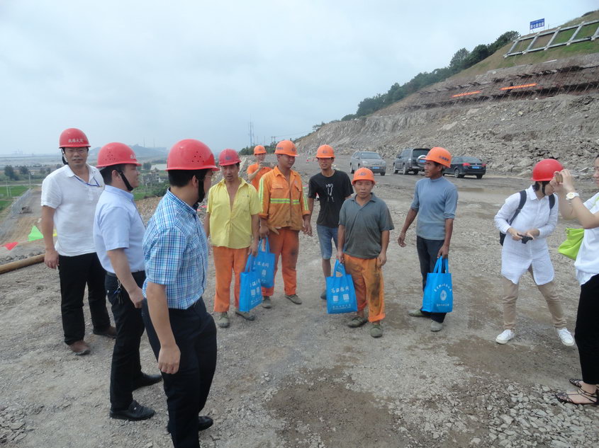 慰问组一行来到2标后塘山高边坡上给一线工人送去清凉,并在项目部会议室召开调研座谈会。会上,专项办主任郑小瑶、副主任陈凌云分别就目前乐清疏港公路进展情况和存在问题作出汇报。在听取汇报后,温州市总工会李主席、梁部长,市重点办王处长和乐清市总工会对乐清疏港公路监理办近几年来取得的成绩做了充分肯定,并就“两美·五化”建设提出有关要求和建议。