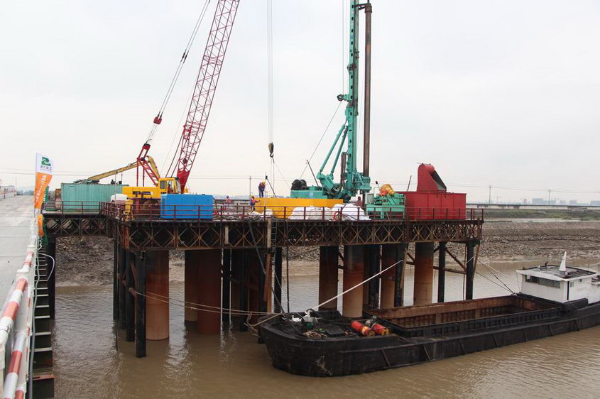 瓯江口跨海南大桥是甬台温复线灵昆至阁巷段的控制性工程,全长为5.7公里高架桥。本次开钻的桩基位于瓯江口跨海南大桥引桥。由于大桥跨越瓯江南汊、瓯飞一期围垦工程北堤及滨海围垦海堤,给施工增加了不小的难度。为保证项目的顺利施工,项目部做了大量前期准备工作。截止目前,北岸工区项目驻地、拌合楼、工地试验室等均已建成并投入施工,北岸栈桥已向江中搭设600余米。
