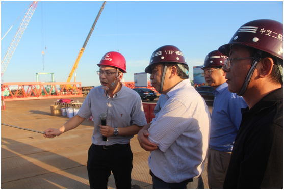 7月19日下午,在省交通厅副厅长任忠带队下,由省公路局、省国土厅、省环保厅、省交通集团等单位代表组成的督察小组来到温州瓯江北口大桥施工现场督察工程进展情况。市交通局局长董庆华、副局长蒋理江、徐锦栋,集团董事长秦肖、总工程师周列茅,温州瓯江口大桥公司总经理郑锋利等陪同。
