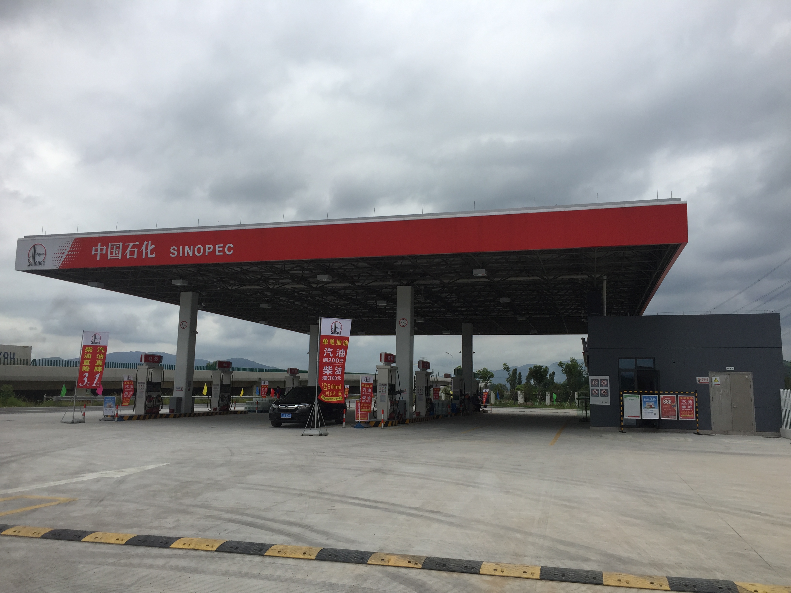 陶山服务区加油站位于瑞安市陶山镇境内,加油站以南、北侧对称的形式分布。两座加油站各占地面积4500平方米,罩棚投影面积为1100平分米,均配置50立方米油罐5只,安装8台32枪电脑加油机,提供92号、95号、98号汽油和0号柴油等油品。站内汽柴油分区布置合理,有效减少拥堵,提高加油效率,缩短加油时间,可实现全天候为过往车辆及司乘人员提供车辆加油及各项便民公共服务。