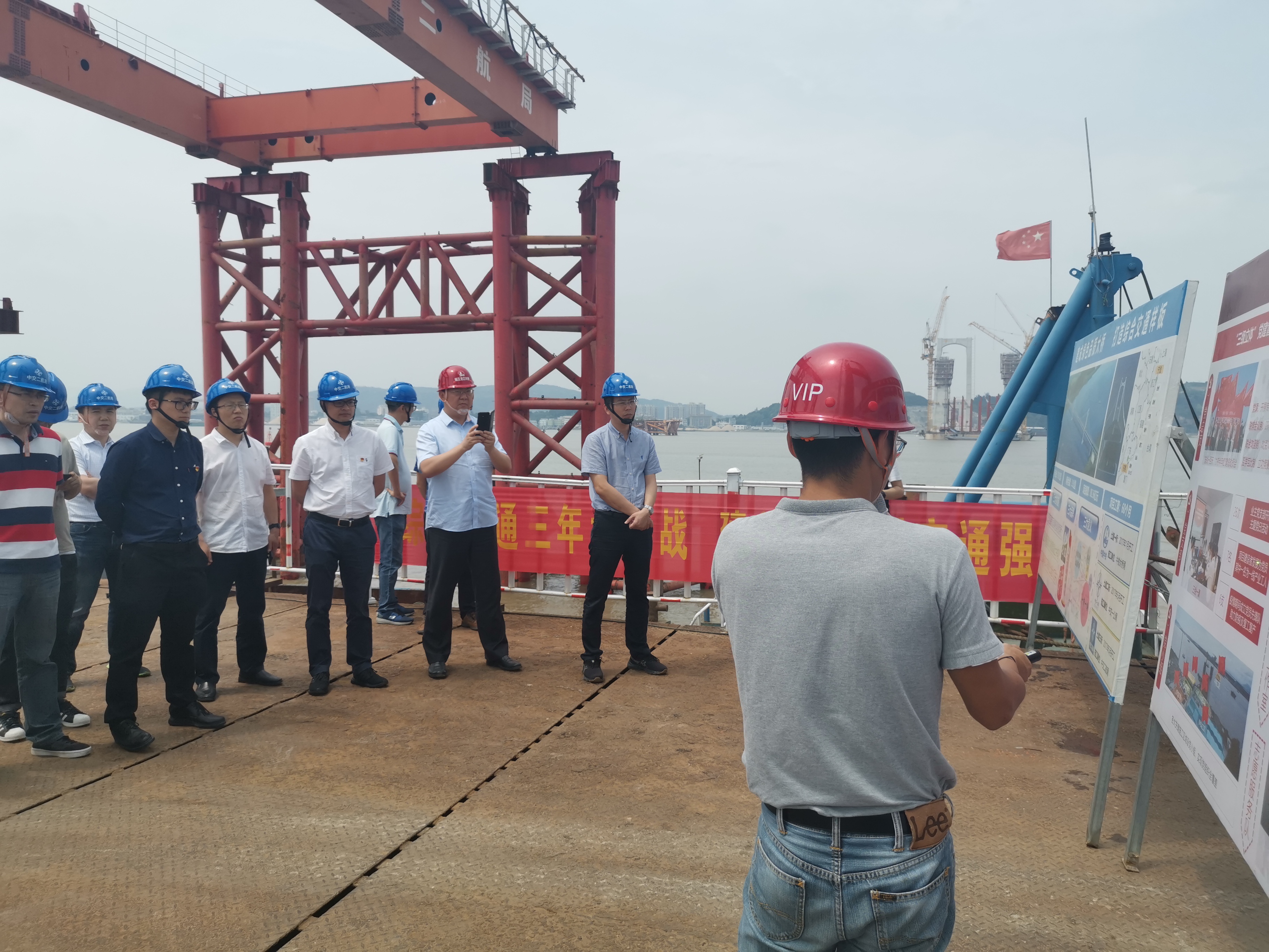 一行人来带项目土建三标南塔施工现场,听取项目概况、工程进度、党建品牌及产业工人等方面的介绍,详细询问了关于世界首个强潮河口超大型沉井的施工难点,对项目取得的成绩表示肯定。