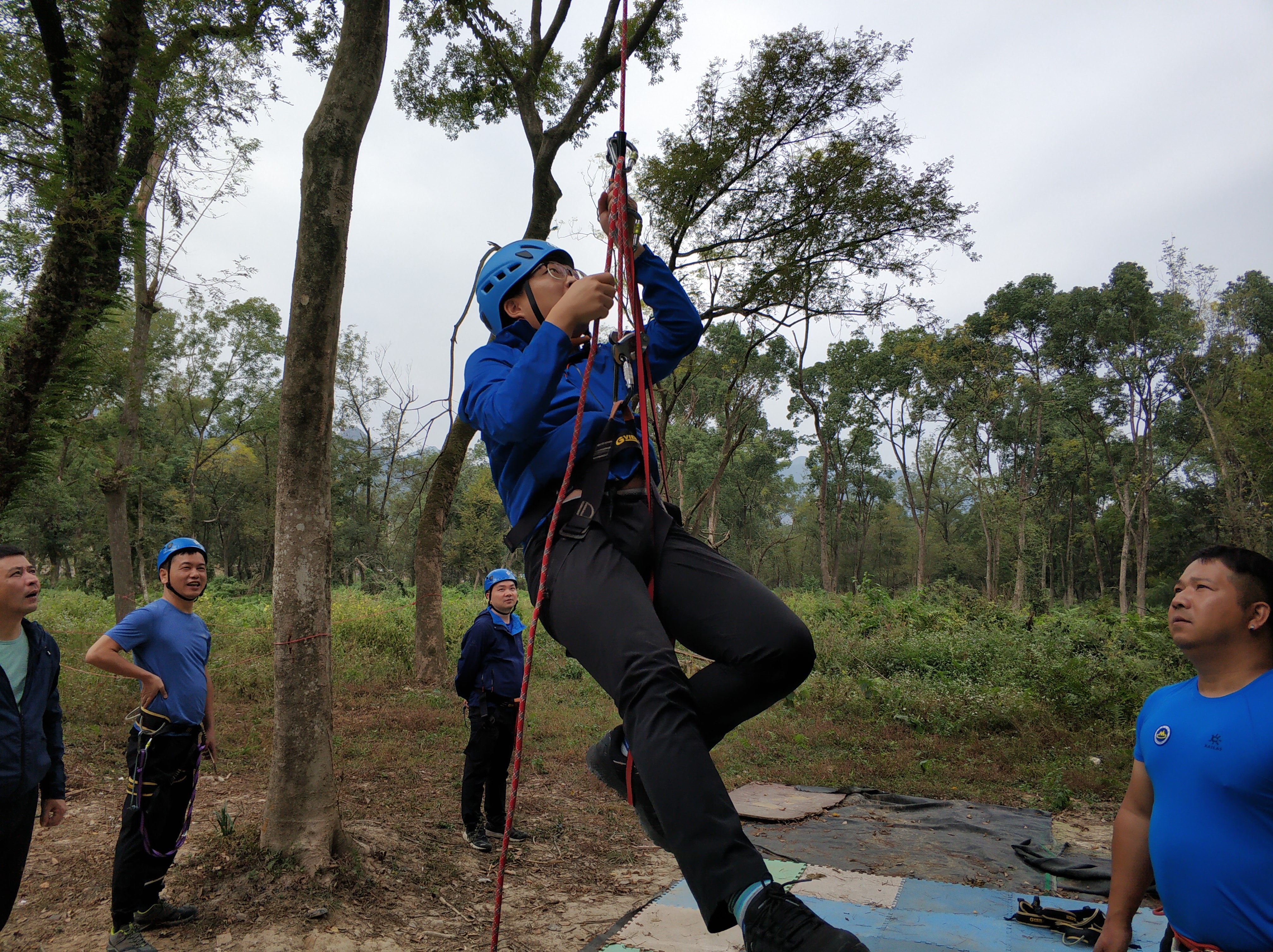 在经过前几期的练习和巩固,救援队大部分队员已经可以较熟练的掌握并运用基础卫星导航定向搜索、绳结技术、上升下降技术和紧急救护等技能。此次训练,重点要求队员了解掌握手式上升器、八字环等装具的使用,并能熟练运用SRT单绳上升转下降和挽复式双绳下降的技能。经过专业教练的指导,全体队员踊跃尝试,积极练习,努力克服四肢酸疼、体能下降等方面带来的困难咬牙坚持,全部独立完成计划设置的课目内容。