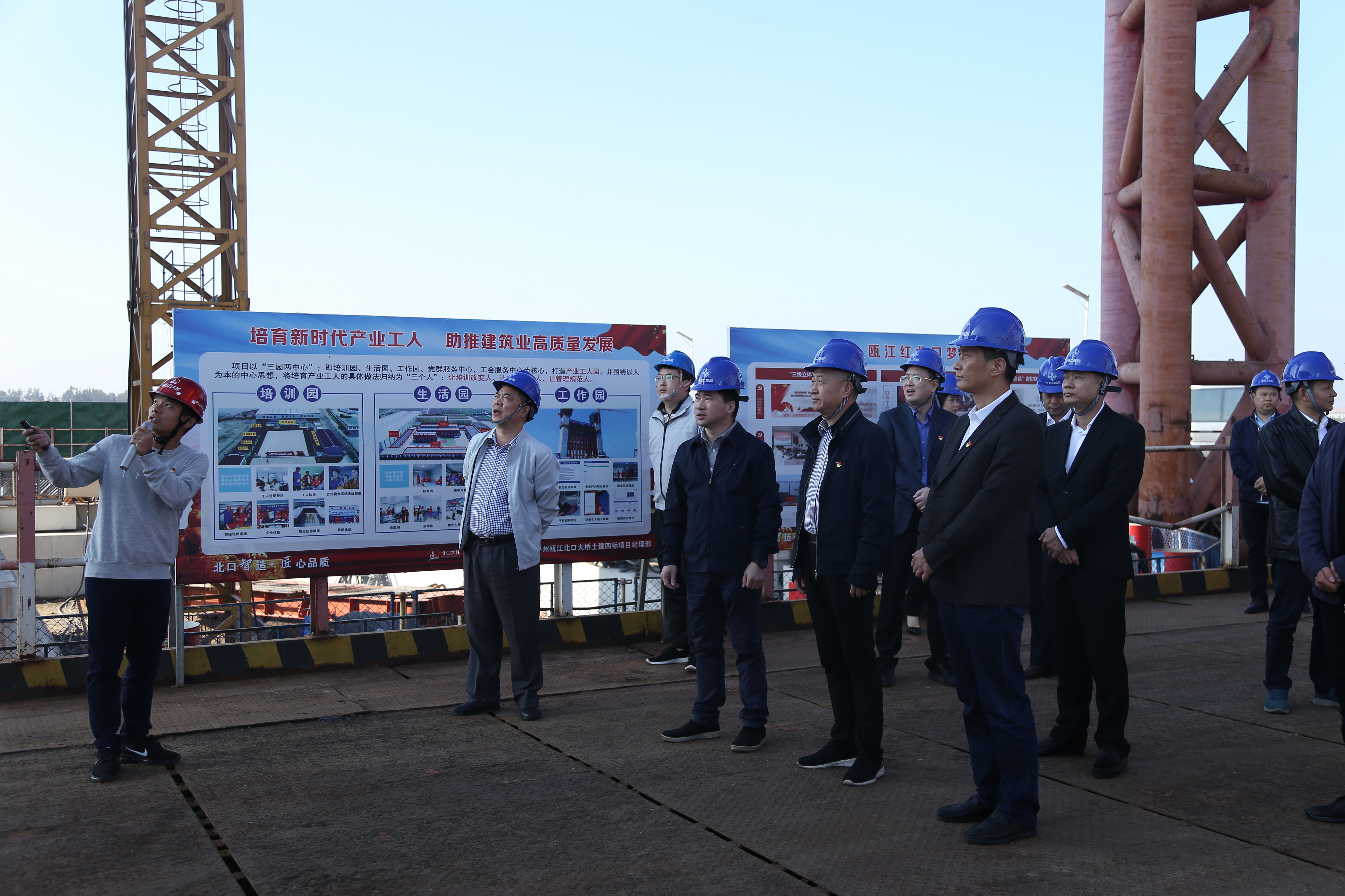 11月26日,市委宣传部副部长、市文明办主任、市文明指导中心主任徐伟中带队,与集团在瓯江北口大桥工地开展“党建引领、共筑文明”主题党日联学共建活动,集团党委书记、董事长朱三平,总经理南品仁,党委副书记周列茅,瓯江口大桥公司全体党员等共同参与。