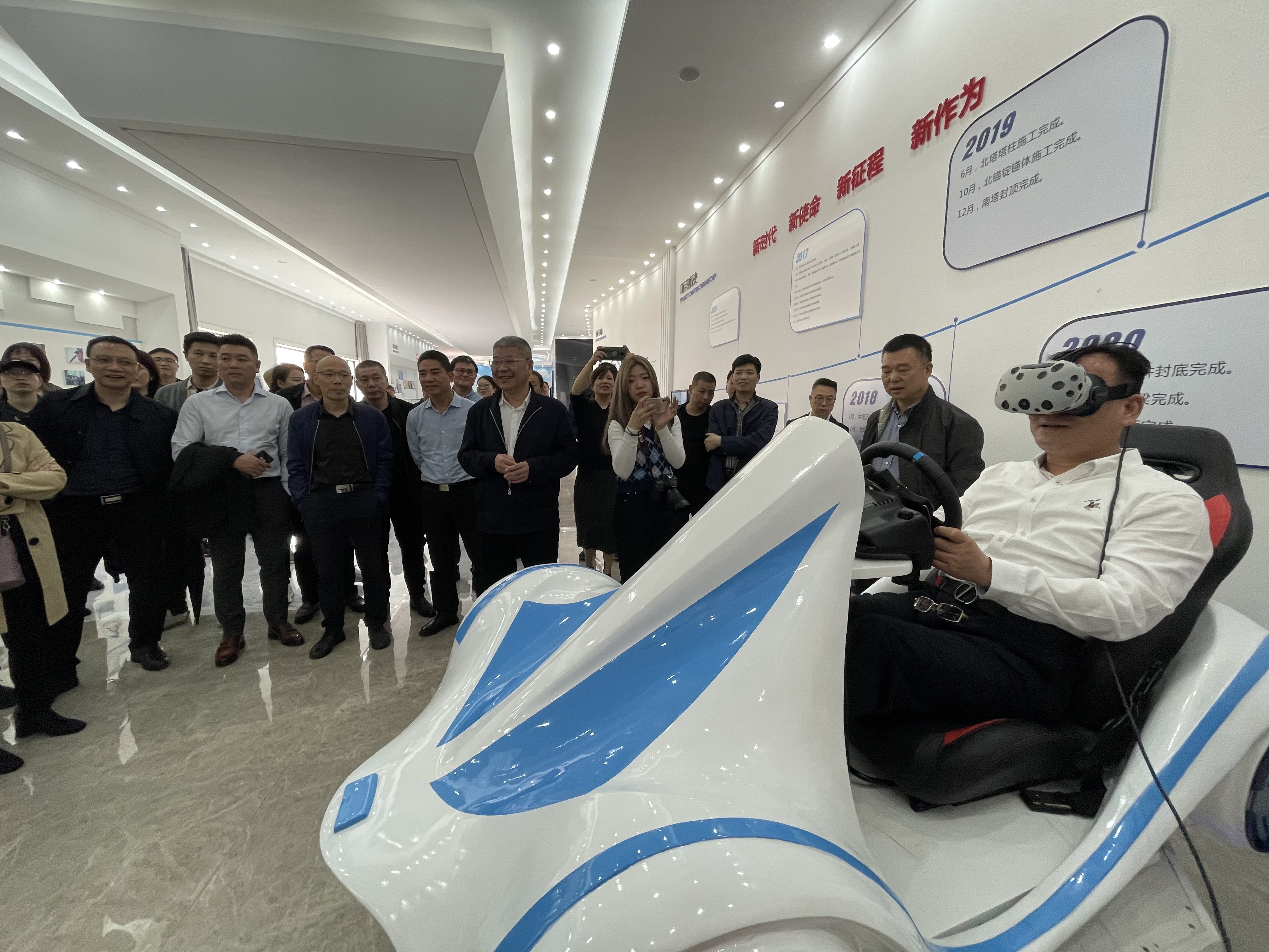 随后,一行人参观了项目的“五型三化”党群服务中心,在项目桥梁展示馆观看了项目宣传片,近距离观看项目模型和构件模型,认真听取项目建设过程中的难点和亮点工作,仔细询问BIM信息化平台及微创新微改造的成果并在BIM体验区体验项目虚拟驾驶。