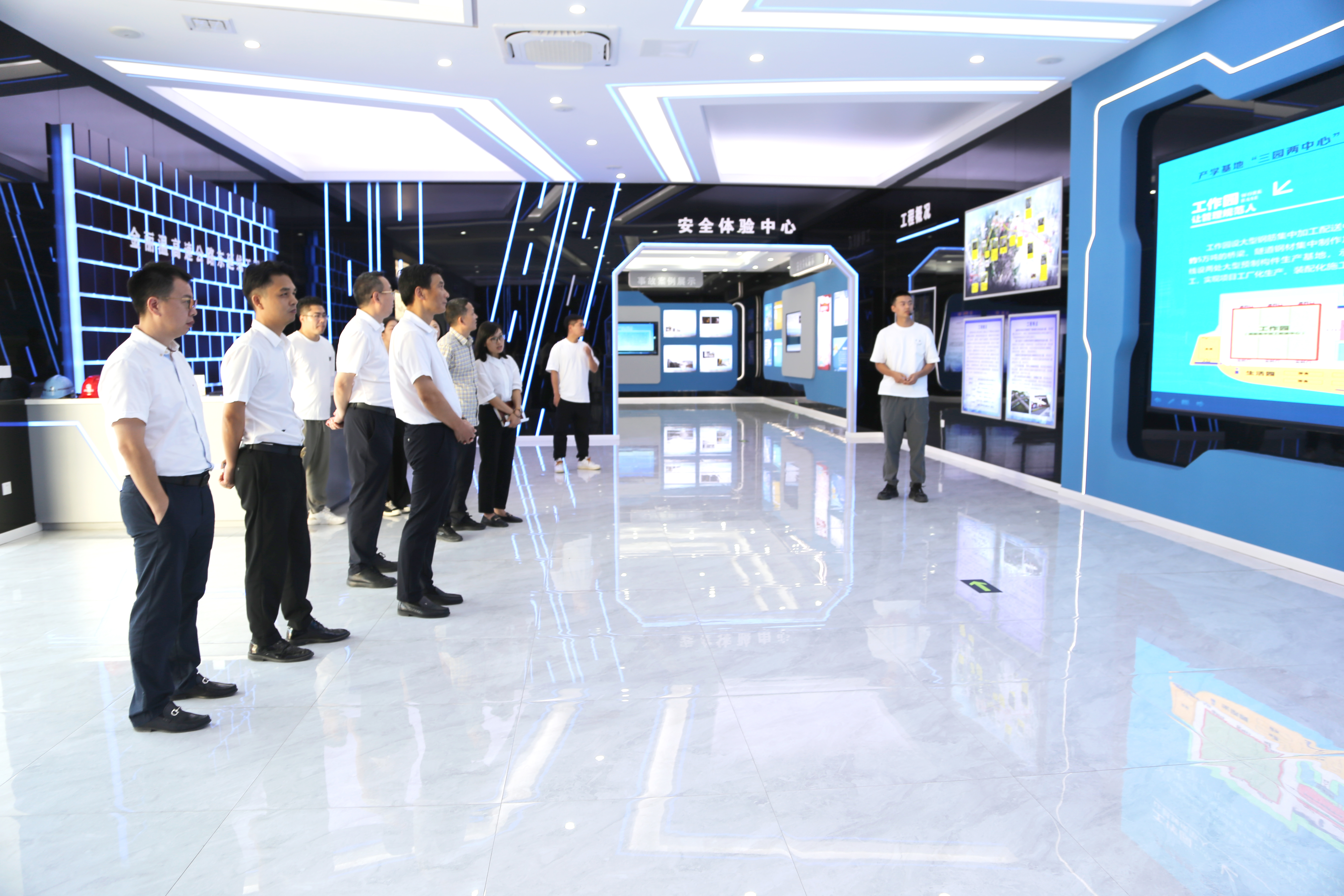 余庆一行首先来到东延线公司办公楼,通过实地查看、现场讲解、座谈交流等方式,详细了解了公司组织架构、活动开展、志愿服务、垃圾分类等情况。接着前往东延线工程产学基地参观,对东延线工程项目概况、工法工艺、科技创新、安全教育等方面进行深入了解。