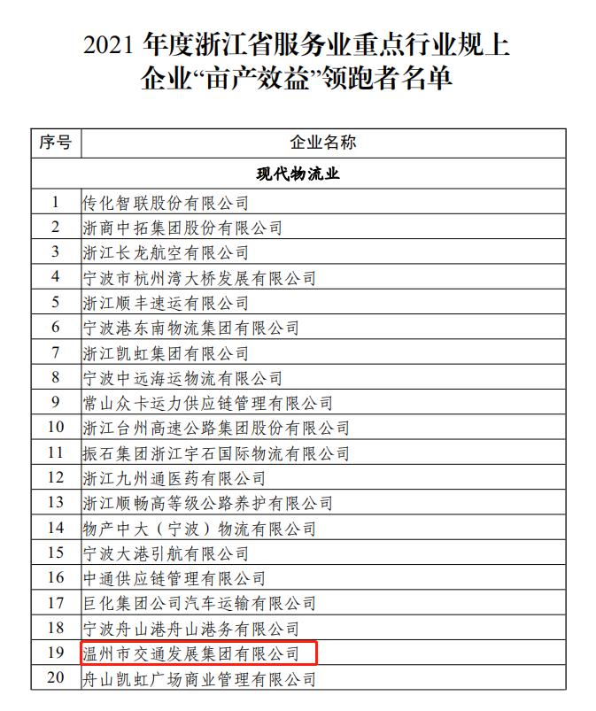 近日,浙江省现代服务业发展工作领导小组办公室公布2021年度浙江省服务业重点行业规上企业“亩产效益”领跑者名单,市交发集团榜上有名,为温州市现代物流行业唯一一家获此殊荣的企业。